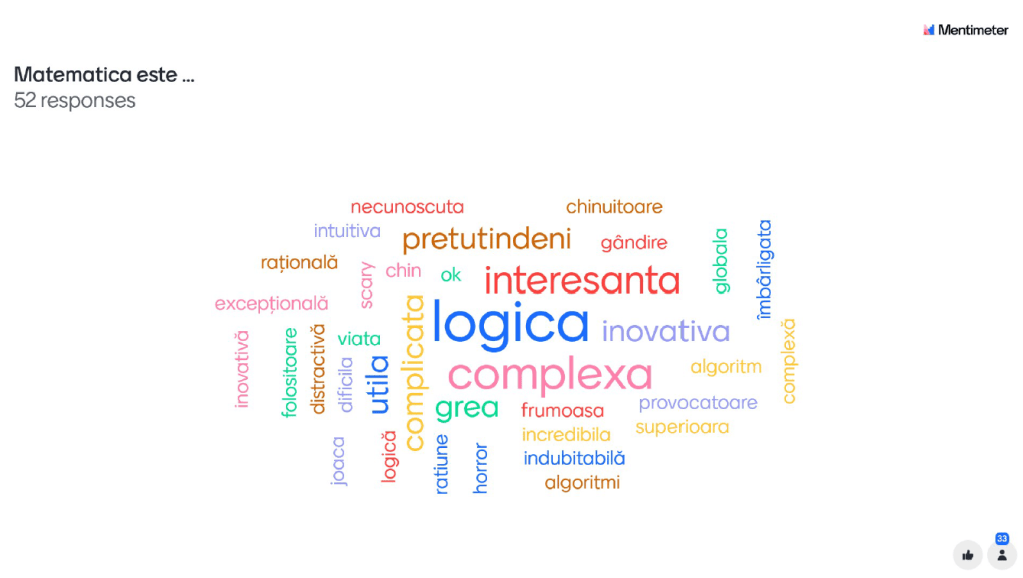 Activitatea a început cu realizarea unui nor de cuvinte realizat cu ajutorul cuvintelor adăugate de elevi pentru a completa spațiul gol din propoziția Matematica este __; apoi, am discutat despre cercetarea în matematică, despre asemănările și diferențele dintre cercetarea în domeniile STEM și am vizionat videoclipul Inside the mind of the award-winning mathematician Cedric Villani.