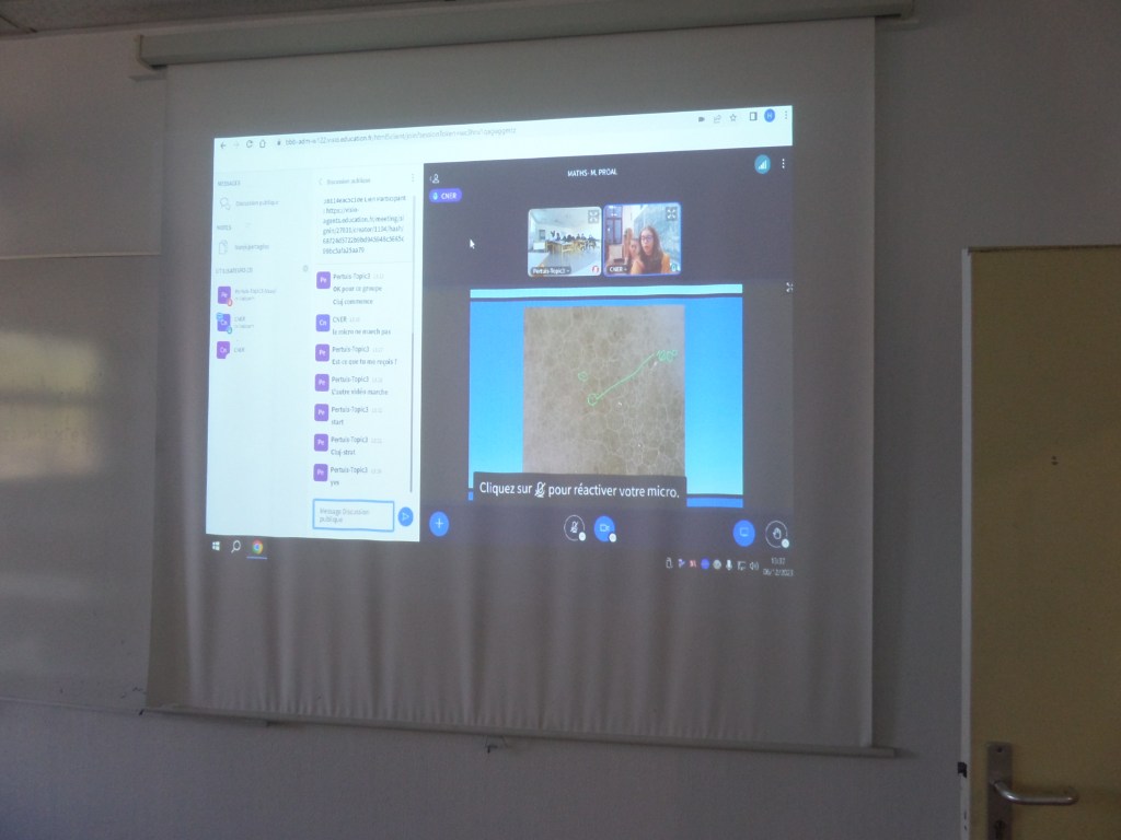 În cadrul videoconferinței de miercuri, 6 decembrie 2023, cele trei grupe de elevi (două grupe de la Lycée Val de Durance – Pertuis și o grupă din CNER) au discutat despre abordările lor diferite. În acest moment, elevii analizează drumul cel mai scurt între trei puncte. Elevii din clasa a XII-a din Pertuis au reușit să arate că într-un triunghi isoscel ABC, punctul S cu proprietatea că SA+SB+SC este minim este unic și este plasat astfel încât unghiurile ASB, BSC și CSA să fie egale cu 120°. A doua grupă din Pertuis a efectuat un experiment pentru a verifica acest rezultat și grupul din Cluj a construit modele pentru a verifica acest rezultat cu baloane de săpun. Aceste abordări originale și diferite vor fi combinate pentru a duce munca de cercetare mai departe.