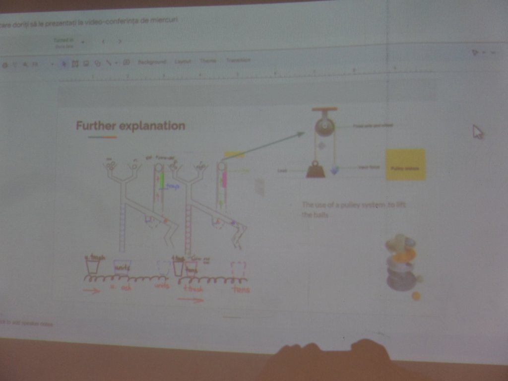 Toți elevii au prezentat și discutat rezultatele la care au ajuns până acum. Trebuie făcute ajustări pentru a îmbunătăți machetele tuturor, pentru a crea prima mașină de adunat care să funcționeze numai cu bile care cad. Provocarea este de a perfecționa aceste prototipuri pentru a obține un rezultat operațional și inovator, o dovadă a ingeniozității acestor cercetători în devenire.