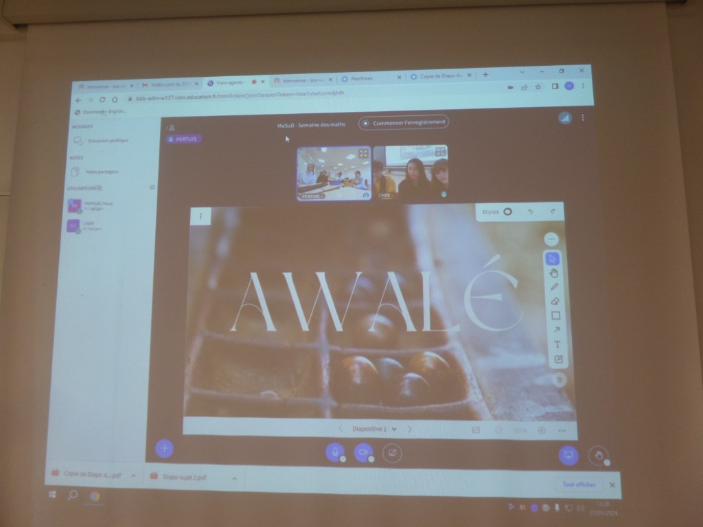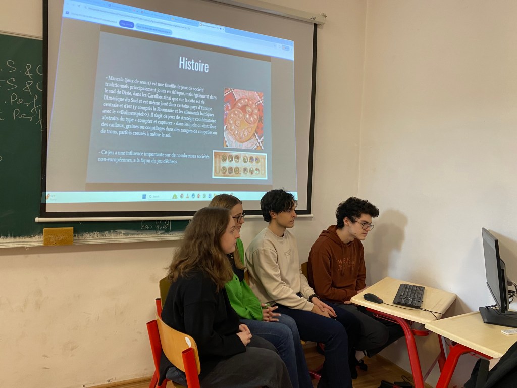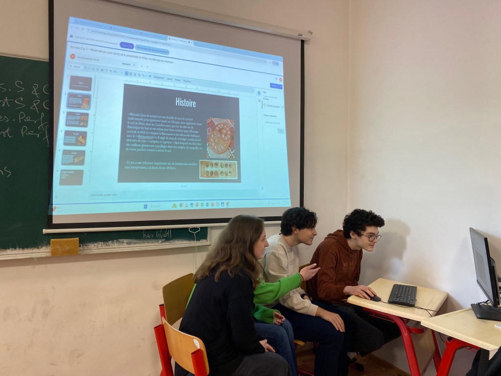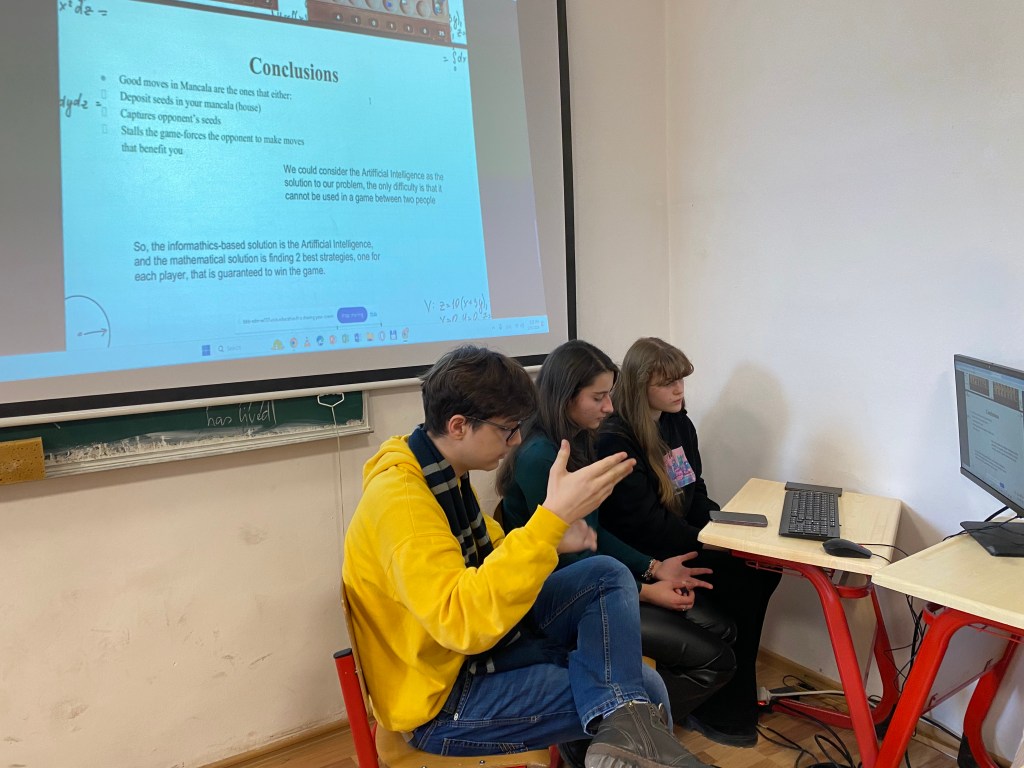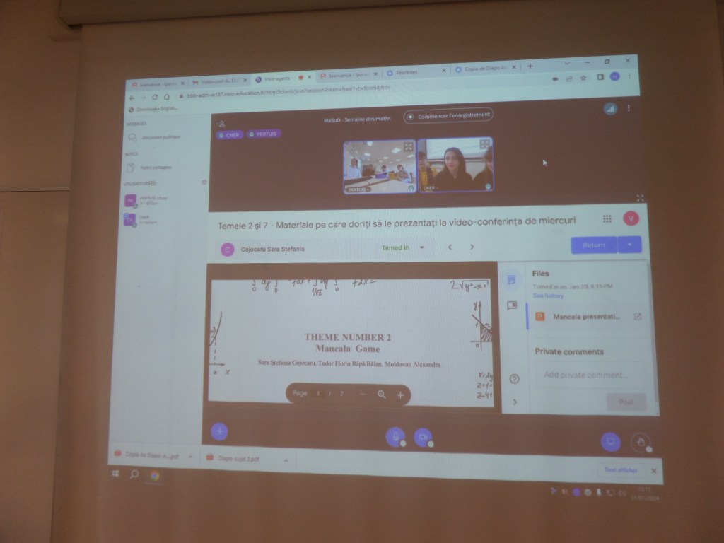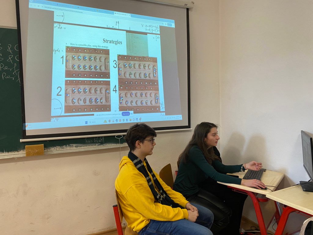 În cadrul proiectului „Atelier de cercetare în matematică” între Colegiul Național Emil Racoviță (RO) și Lycée Val de Durance (FR), elevii care și-au ales tema de cercetare Mancala (Awélé) au participat la o videoconferință. Tema de cercetare presupune studiul acestui joc în vederea programării unei strategii care să fie jucată de o mașină.