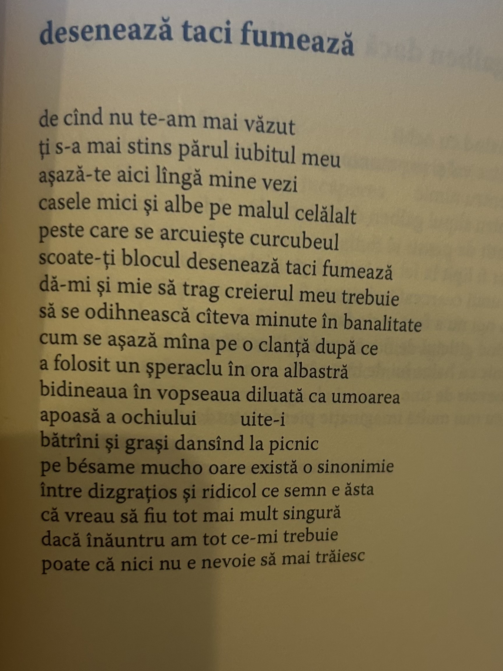 Mi-a plăcut spectacolul înainte de orice, mi-a plăcut rampa, mi-au plăcut luminile, mi-a plăcut publicul, aplauzele, mi-a plăcut secretul acela teribil al cortinei, totdeauna m-a interesat ce e după cortină, adică momentul cel mai fascinant pentru un copil, cel puţin pentru unul ca mine, că mă duceau părinţii la teatru şi la operă mai ales fiindcă mama dansa, dar momentul teribil era înainte de începerea spectacolului când vedeam cortina aceea bordo de pluş şi când începeau luminile să se estompeze până la întuneric şi apărea dirijorul la pupitru acolo jos, în fosa orchestrei, şi se făcea după aceea după aplauze o linişte mormântală şi atunci simţeai nişte furnicături teribile pentru că ştiai că se deschide altă lume.