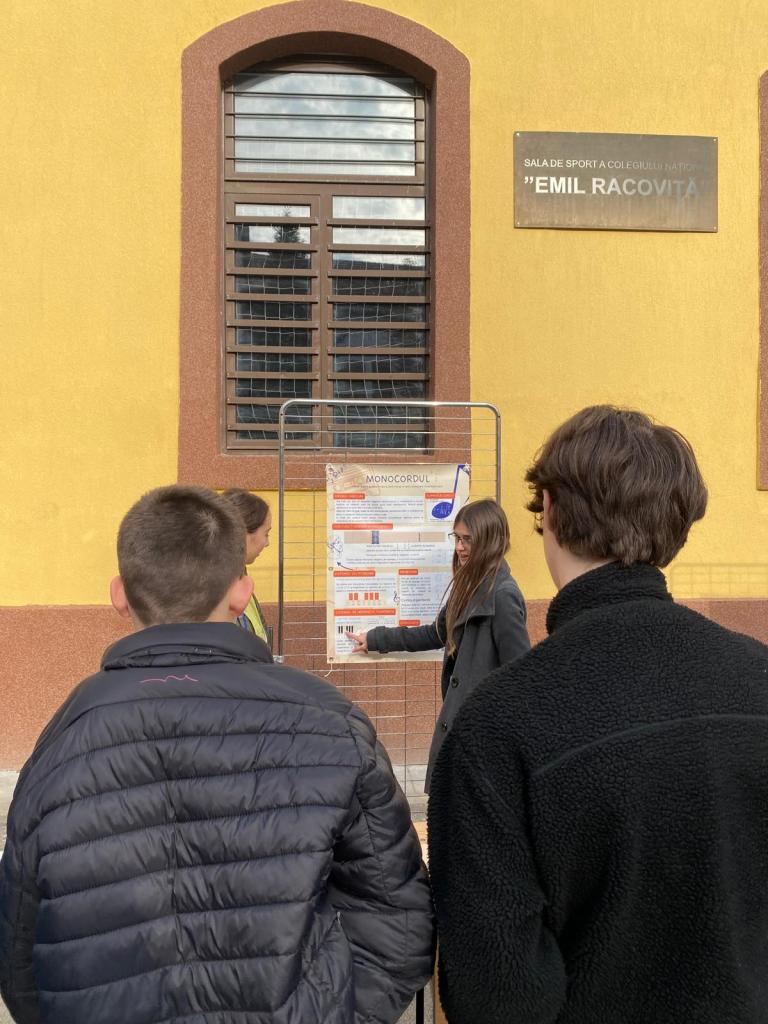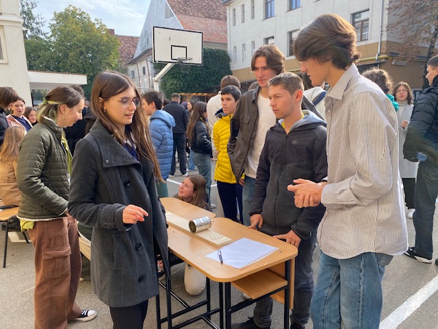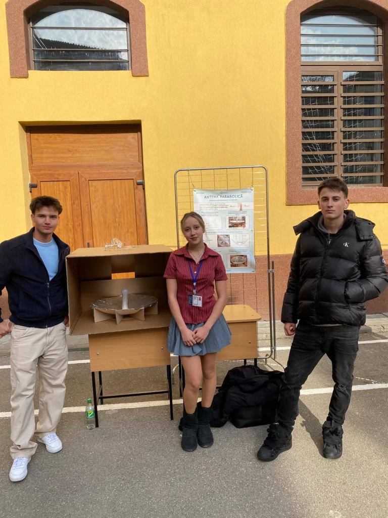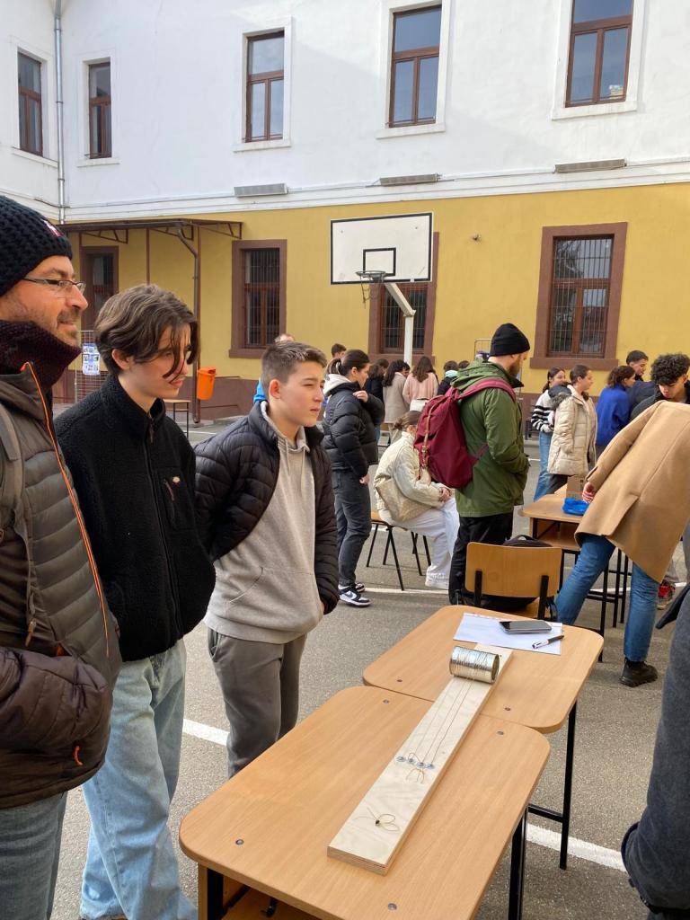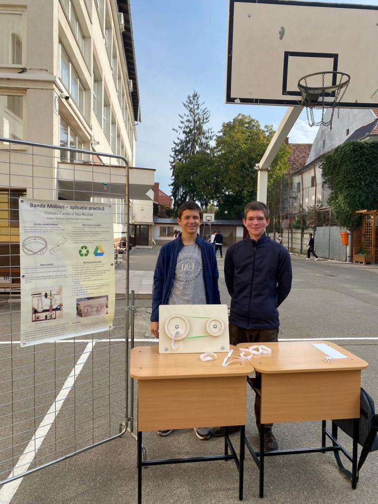 A urmat vizitarea expoziției „Matematica este (și) vizibilă – ediția a III-a” în curtea școlii, prezentată de colegii din clasa a 10-a B. Aici am văzut interpretarea fizică a diferitelor concepte matematice, cum ar fi banda Möbius, antena parabolică, paradoxul disecției triunghiului, monocordul și vendomatul.