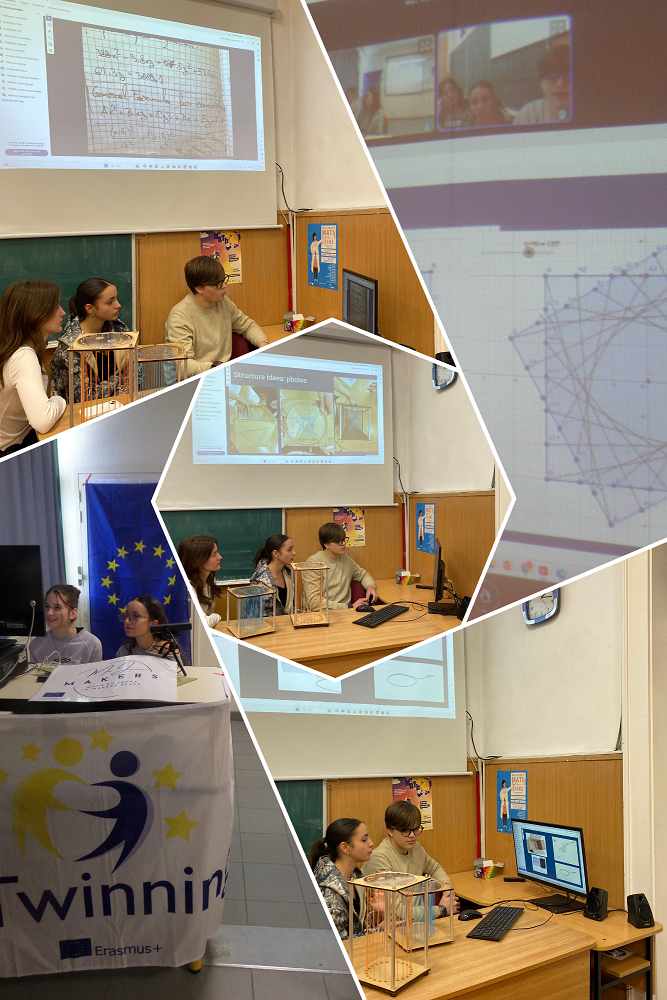 Proiectul ERASMUS+ MeJ Makers reunește elevi francezi și români pentru a lucra pe teme de cercetare matematică adaptate nivelului lor. În cadrul acestui proiect, grupurile care lucrează pe tema 10, „fire tensionate”, s-au întâlnit miercuri, 13 noiembrie 2024, prin videoconferință. Timp de o oră, cele două grupuri și-au prezentat abordările, rezultatele la care au ajuns până acum și pistele de cercetare care urmează să fie explorate. Aceste schimburi vor continua pe platforma TwinSpace MeJ Makers, în timp ce munca de cercetare continuă. O serie de idei de machete au fost propuse și ar putea fi puse în practică în săptămânile următoare, pentru a oferi suporturi vizuale care să ilustreze subiectul.