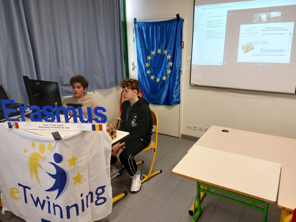Miercuri, 26 noiembrie 2025, tema „cube à trou” s-a aflat în centrul unei noi întâlniri online dintre elevii Colegiului Național Emil Racoviță din Cluj-Napoca și cei ai Lycée Val de Durance din Pertuis, Franța, în cadrul proiectului ERASMUS MeJ Makers.