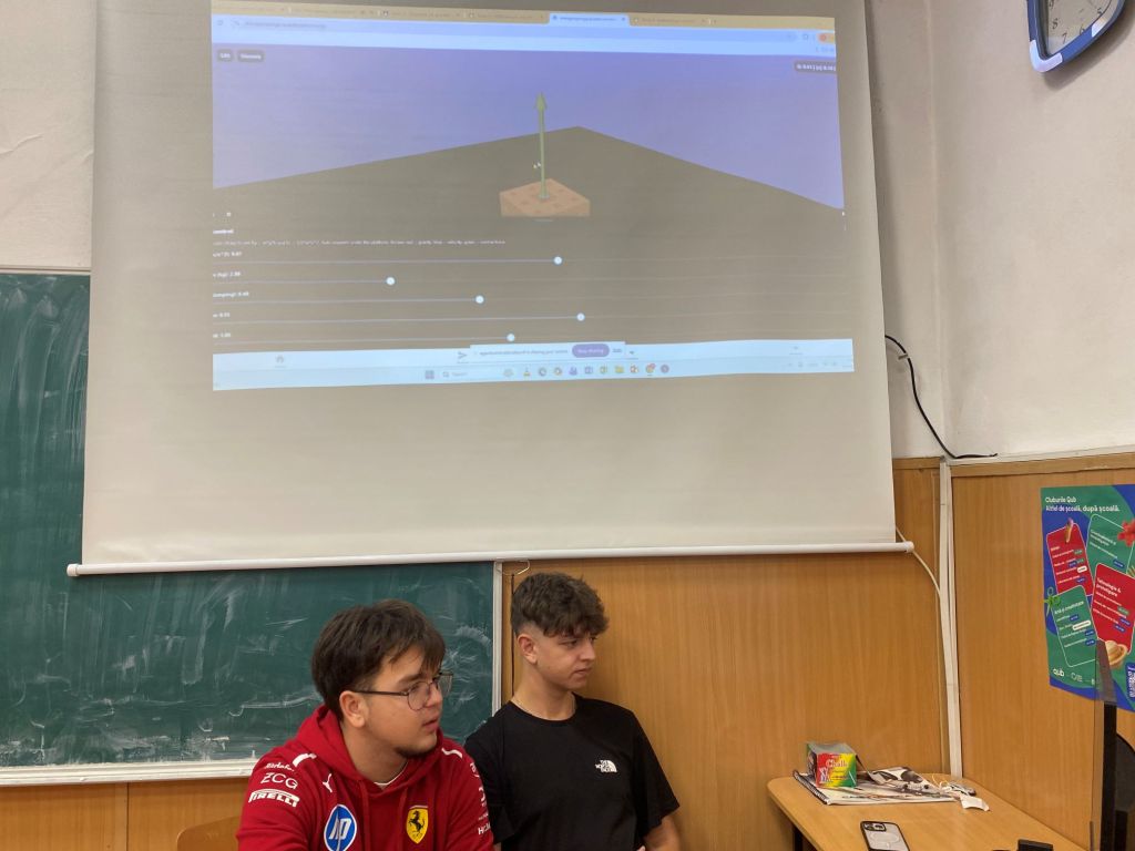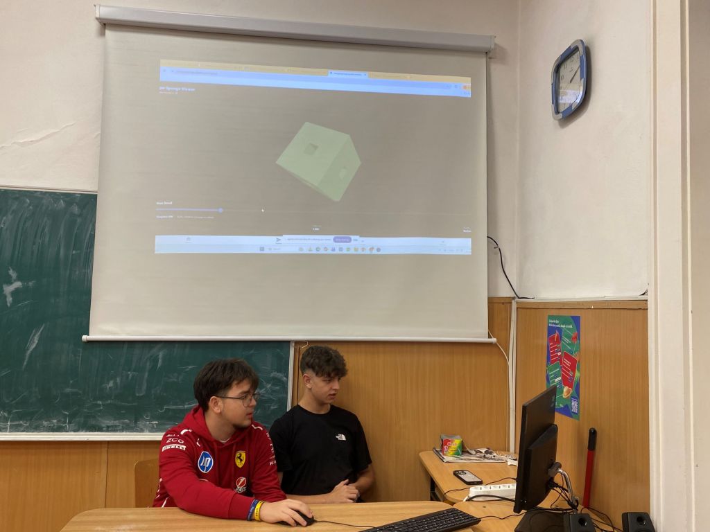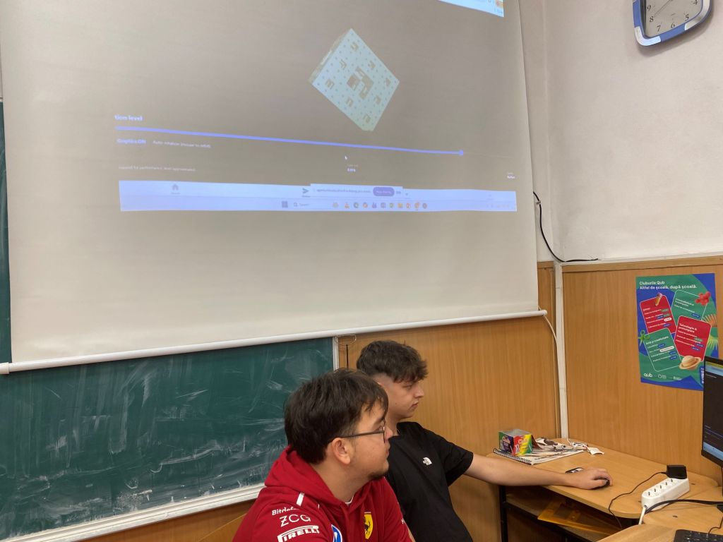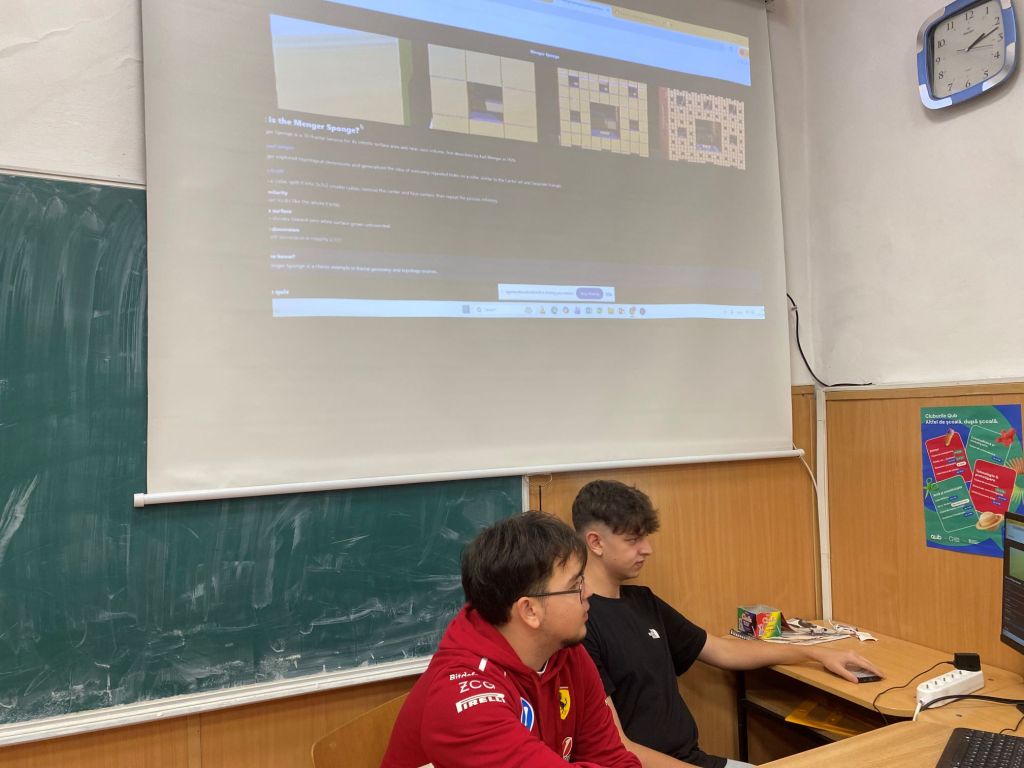 Prezentările elevilor francezi au deschis sesiunea, aceștia explicând pașii urmați în analiza evoluției acestei figuri geometrice și împărtășind calculele realizate până acum. Elevii noștri au continuat cu prezentarea propriilor rezultate. Printr-o modelare realizată în JavaScript, ei au reușit să vizualizeze transformările cubului și să calculeze elementele esențiale ale structurii sale. Această abordare digitală a adus un plus de claritate și a demonstrat modul în care instrumentele informatice pot sprijini înțelegerea conceptelor matematice complexe.