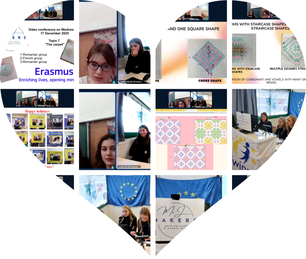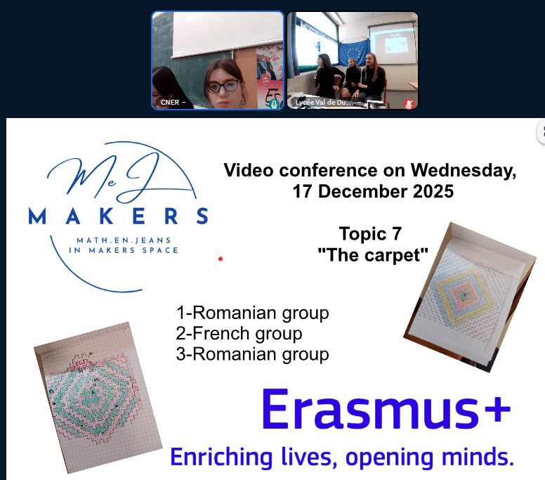 Ultima videoconferință din 2025 organizată în cadrul proiectului ERASMUS MeJ Makers a adus împreună trei grupuri de elevi din România și Franța pentru a prezenta rezultatele obținute pe tema „covorului MeJ Makers” – un exercițiu interdisciplinar ce îmbină matematica, informatica și creativitatea lingvistică.
