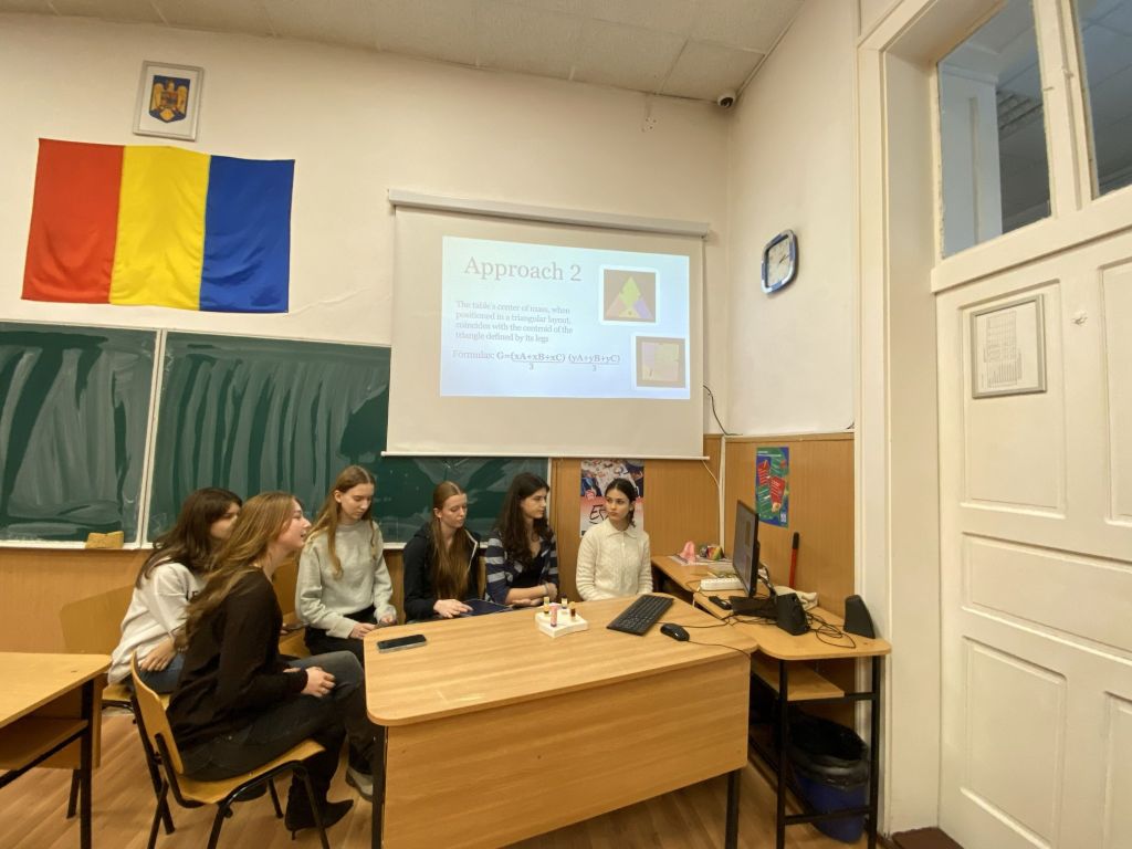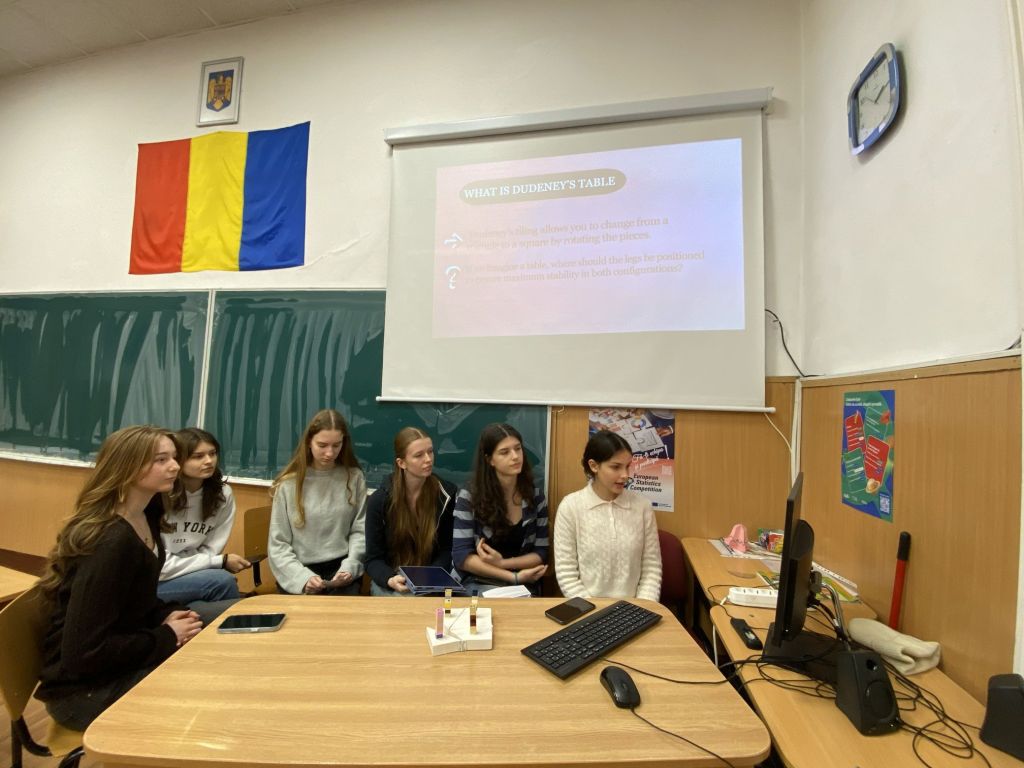 Întâlnirea a marcat începutul unei noi serii de schimburi academice, în care elevii au prezentat idei, ipoteze și rezultate preliminare legate de un fascinant exercițiu matematic cu aplicații practice: cum pot fi dispuse picioarele unei mese transformabile — care trece din formă pătrată în formă triunghiulară — astfel încât stabilitatea să fie optimă în ambele configurații.