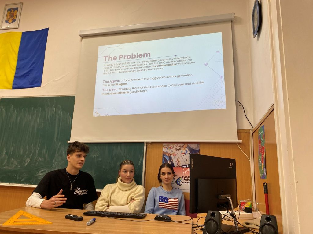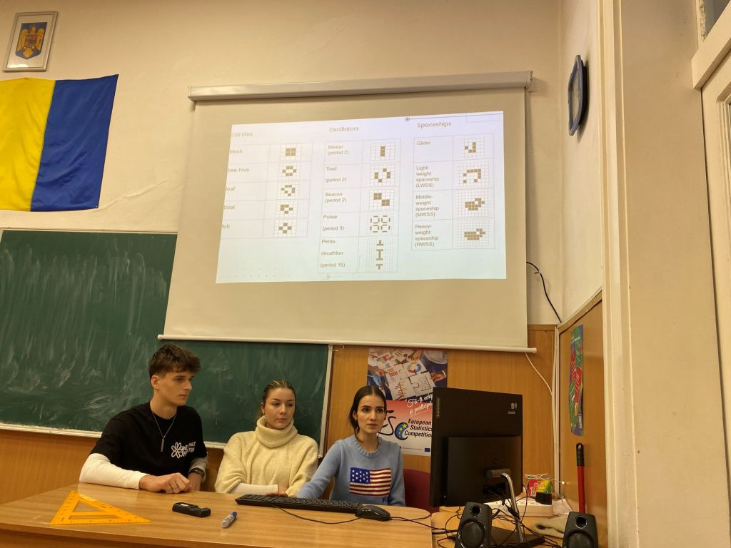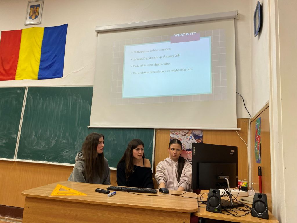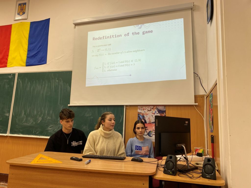 Elevii din CNER au impresionat prin calitatea prezentărilor, fiecare echipă alegând o direcție proprie de explorare: Prima echipă a pus accent pe dimensiunile M și E din STEM – matematică și inginerie. Au analizat riguros regulile jocului, au modelat comportamente ale celulelor și au propus interpretări algoritmice clare, demonstrând o înțelegere solidă a mecanismelor interne ale sistemului. A doua echipă a ales o abordare biologică, explorând analogii între dinamica jocului și procese biologice reale. Prezentarea lor a adus o perspectivă interdisciplinară, conectând tema matematică la fenomene naturale și la modul în care viața se organizează și evoluează. Diferențele de stil au făcut schimbul de idei cu atât mai valoros, iar complementaritatea celor două direcții a fost remarcată de toți participanții.