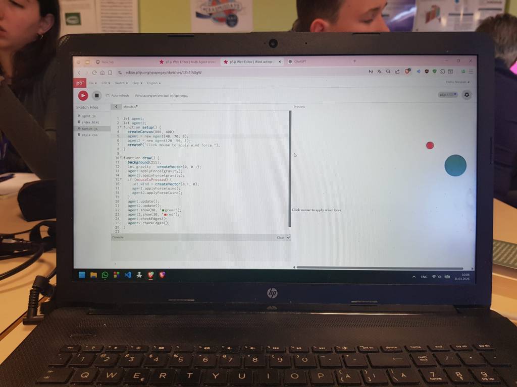 Marți dimineață ne-am îndreptat spre liceu, pentru a continua atelierul de multi-agent crowd simulations. Monsieur Yves Papegay ne-a predat cea de-a doua secțiune a atelierului, urmărind noțiuni interesante de intervenție a forțelor externe asupra obiectelor din simulare.